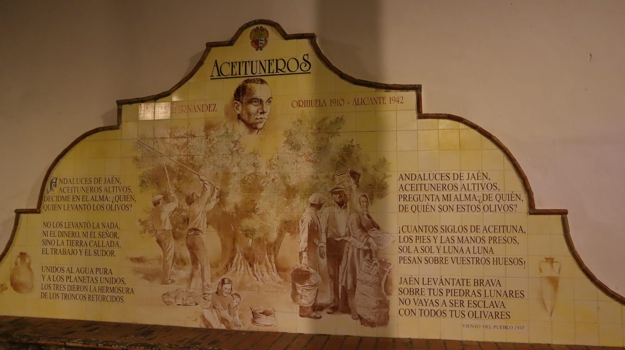 In the heart of the village, a tile mural features the poem Aceituneros — Olive farmers — by Miguel Hernández, one of Spain’s greatest 20th-century poets, who died during the Civil War: