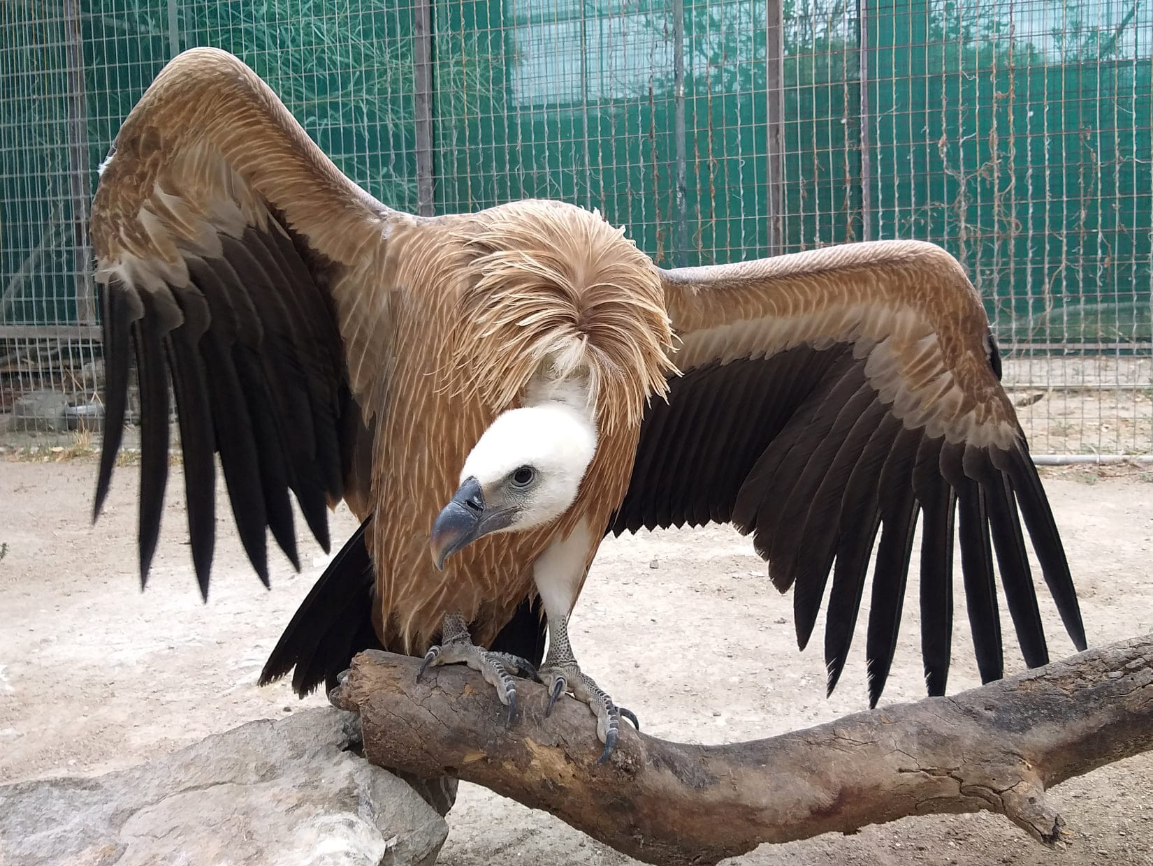 Fournaris tiene i grifoni in una grande voliera nella parte posteriore di Alkyoni che in totale occupa circa due ettari. Mentre ci avviciniamo al loro recinto, mi avverte di non camminare di fronte agli uccelli perché il movimento potrebbe innervosirli. I grifoni sono enormi, con un'apertura alare che va dai due ai tre metri, e hanno un caratteristico ciuffo di piume attorno al collo.