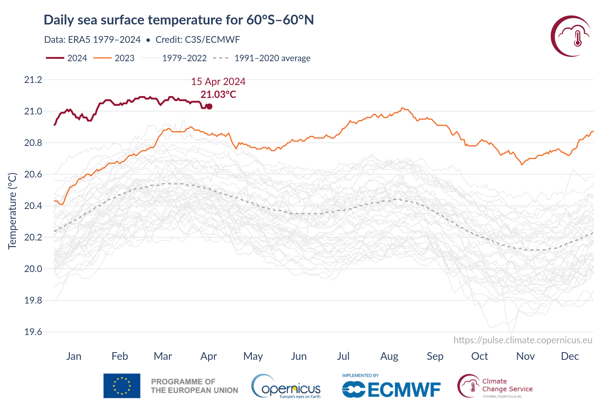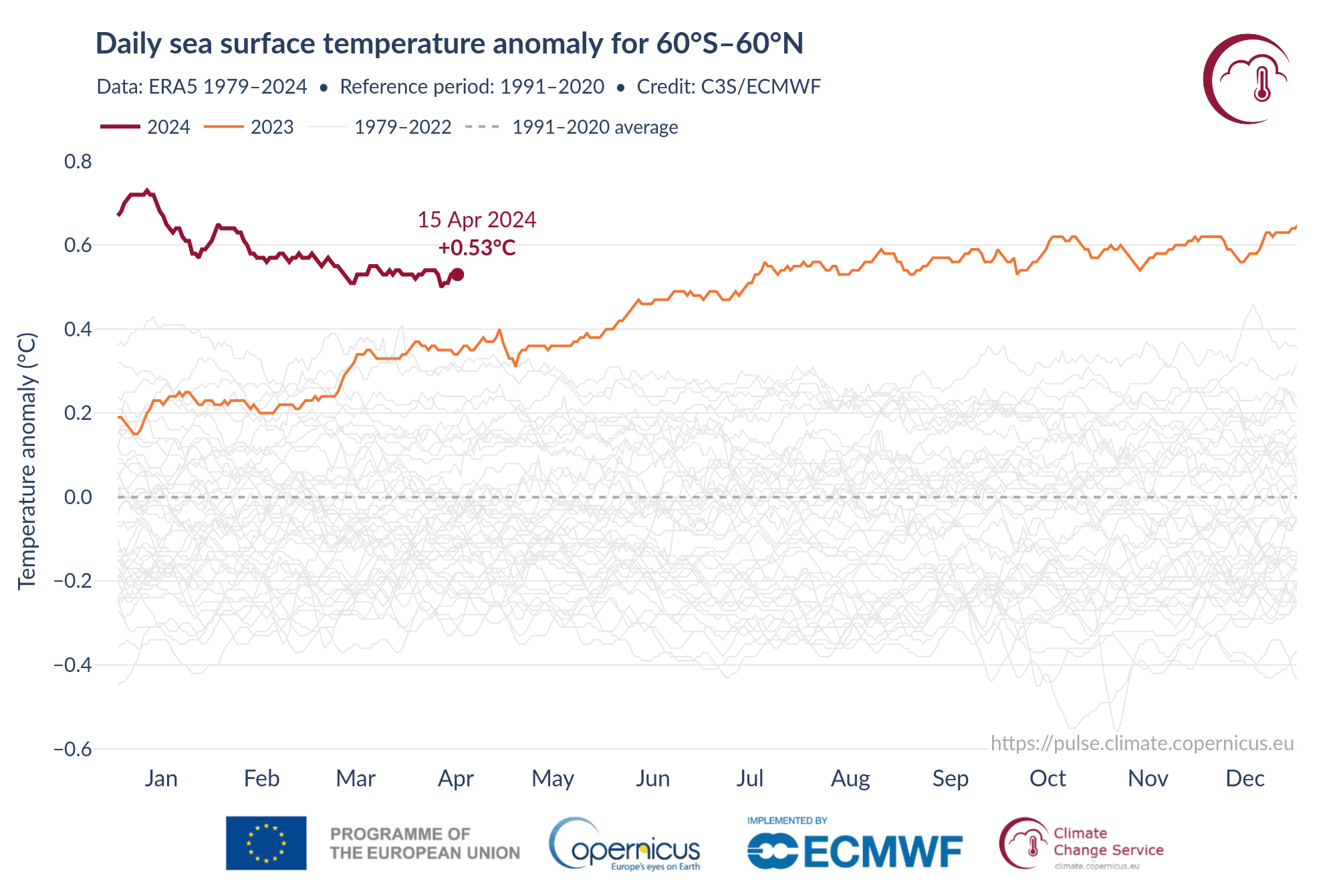Lo scorso anno, invece, come evidente dal grafico, dopo un primo picco a marzo, la temperatura media superficiale dell’oceano ha avuto un picco assoluto ad agosto, oltre a continue anomalie rispetto al ciclo annuale che vanno avanti tuttora. La più alta (0.73 gradi Celsius, secondo i dati del C3s) è stata registrata a gennaio 2024.