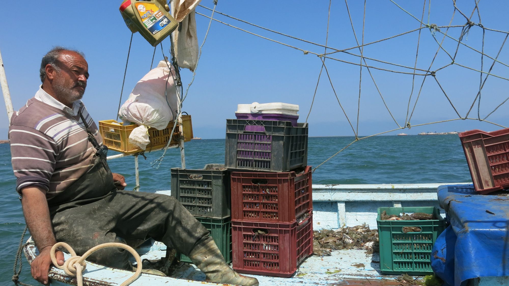 On a gloomy day, Radhia Jouili and her husband, Belgacem Chadi, were returning to Ajim after five hours at sea. They’d caught around 8 kg (17 lbs) of sole and cuttlefish. While Chadi was sailing their 6-meter (20-foot) wooden boat toward the shore, Jouili was busy disentangling blue crabs from the gill net and smashing them. “We must have thrown 50 kilos [110 lbs] of crab, minimum, back into the water,” Chadi says.
